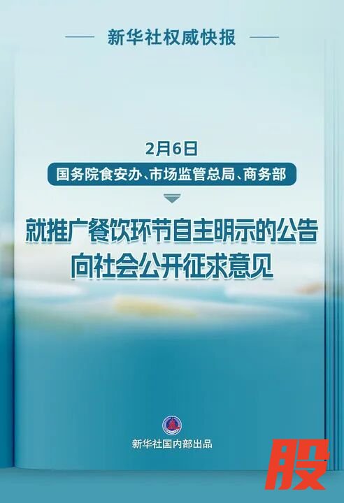 2月6日,国务院食安办、市场监管总局、商务部就推广餐饮环节自主明示的公告向社会公开征求意见。
