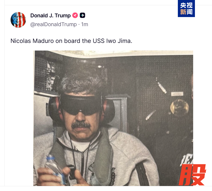据央视新闻消息,当地时间1月3日,特朗普在其社交平台“真实社交”(Truth Social)上发布了一张马杜罗在“硫磺岛”号军舰上的照片。照片中的马杜罗戴着手铐,双眼被黑布蒙住。